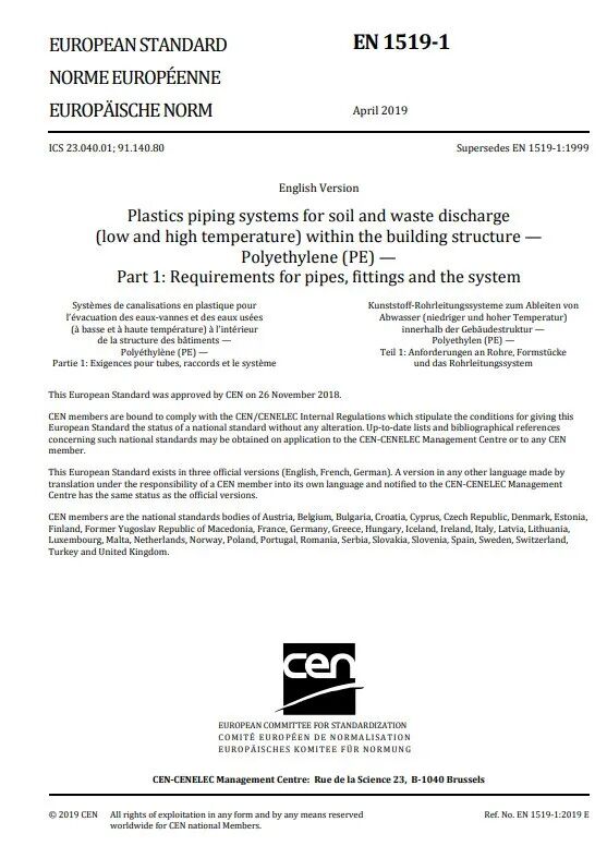 EN 1519-1:2019《建筑内部低温与高温排水系统用聚乙烯(PE)管道系统》 第1部分:管材、管件及系统要求(European Committee for Standardization, CEN)规定,HDPE管道系统应采用电熔或热熔连接方式,确保长期密封不渗漏。
